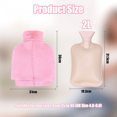 【Hot Water Bottle for Feet Warming】Specially designed for people with cold feet in winter. The extra-wide and large size is suitable for most people's foot sizes, and can up to UK size 9. The elevated design warms more of the ankle area and makes the feet warmer. The furry cover is soft and comfortable to the touch. In addition to preventing burns caused by direct contact with hot water bottle, it can also give you the best comfort experience.